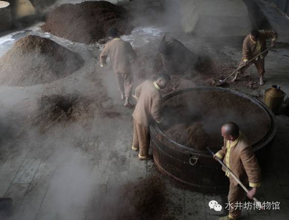 这里真实重现了浓香型白酒酿酒的过程:工匠们剥开封窖泥,将窖池中发酵好的糟醅,用铁叉分层起糟于大筐之中,再用手推车推于晾堂上,浓浓的酒香立刻扑鼻而来。600年来,有不计其数的工匠像这样劳作,数十年如一日的发酵、上甑、蒸馏,演绎“精华在笔端,咫尺匠心难”的传承。正是这样的匠心凝练,才造就了水井坊酒陈香飘逸、甘润幽雅的品质。
