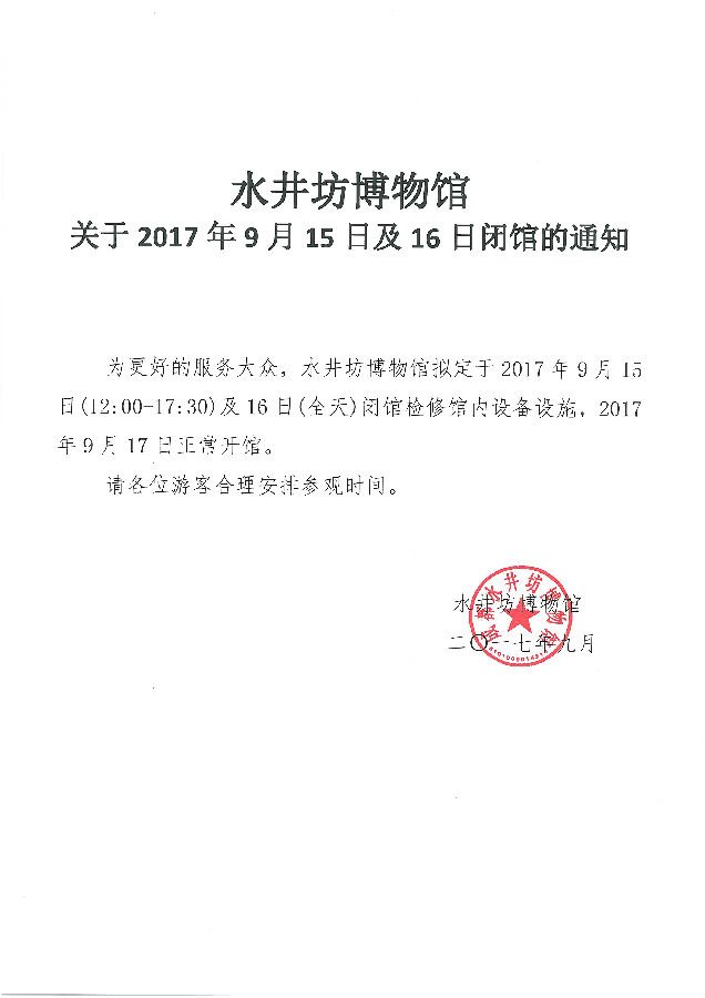 为更好的服务大众,水井坊博物馆拟定于2017年9月15日(12:00-17:30)及16日(全天)闭馆检修馆内设备设施,2017年9月17日正常开馆。