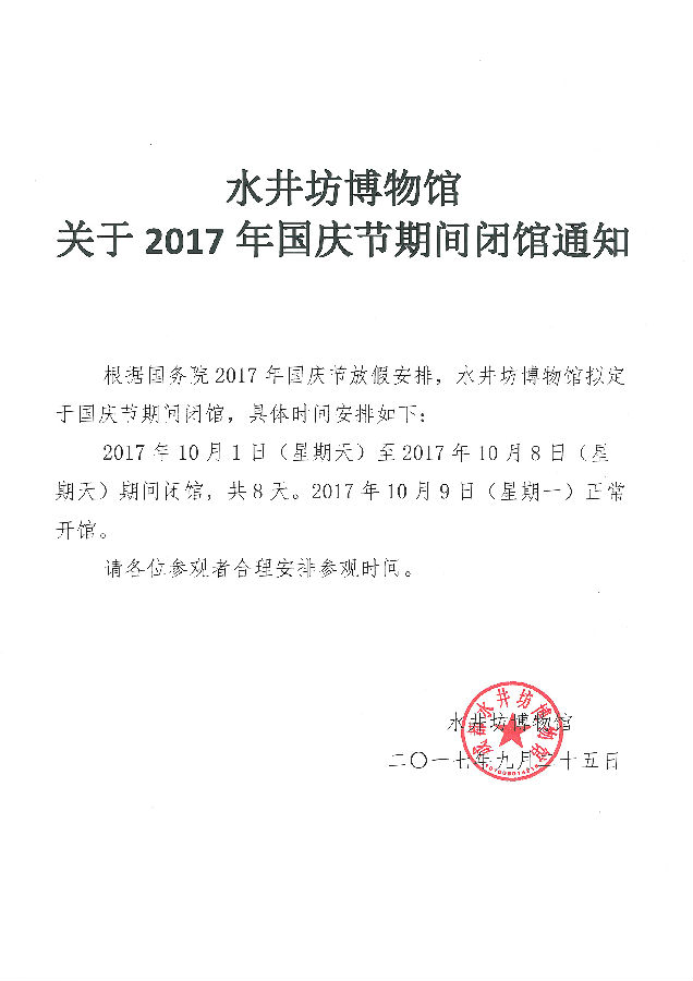 根据国务院2017年国庆节放假安排,水井坊博物馆拟定于国庆节期间闭馆,具体时间安排如下: