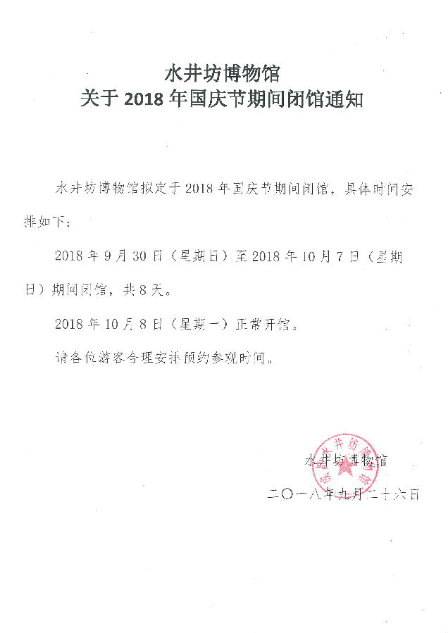 水井坊博物馆拟定于2018年国庆节期间闭馆,具体时间安排如下: